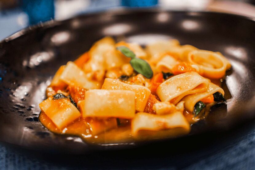 Pasta all’uovo, cozze, vongole, scampi, gambero rosa, pomodoro, prezzemolo, olio e.v.o., sale, pepe